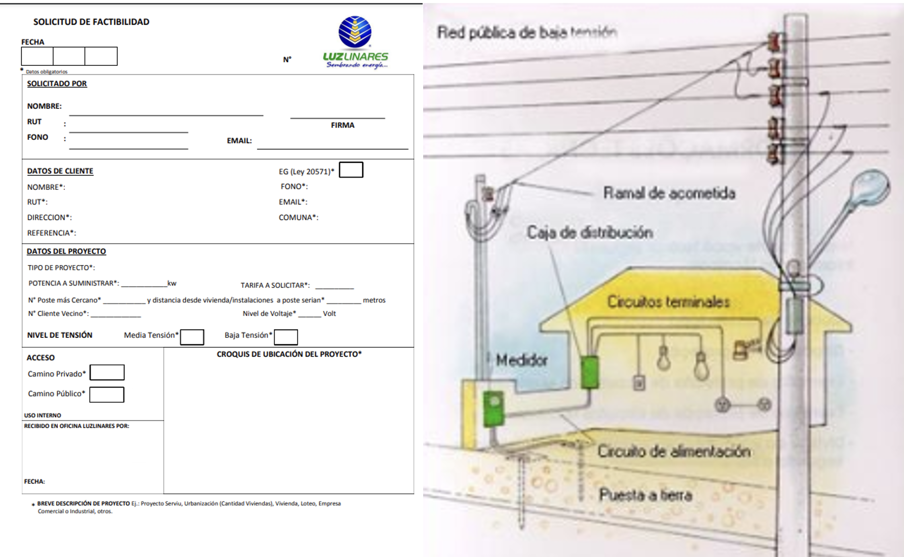 La conexión al servicio eléctrico se acredita por intermedio de la solicitud de factibilidad, a la compañía que corresponde al sector, emplazado en el área urbana o rural.