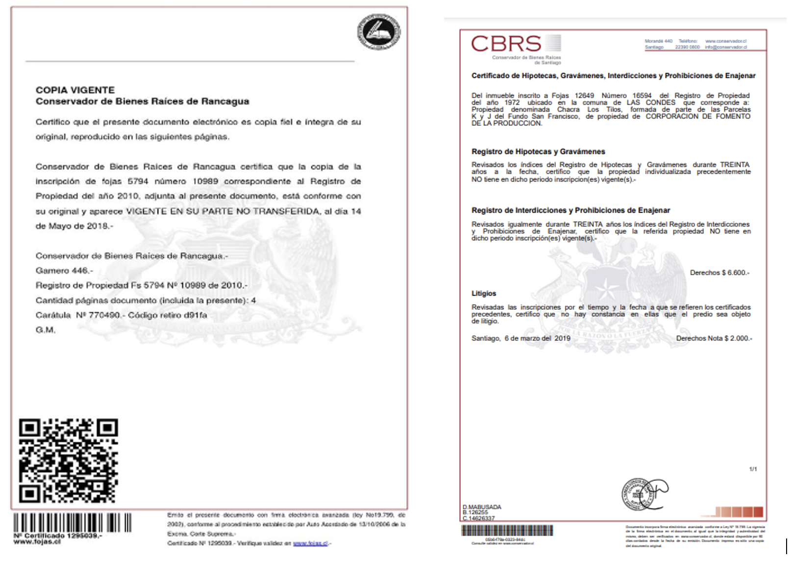 Deberá solicitar en el Conservador de Bienes Raíces de su comuna, Copia del Dominio Vigente de la propiedad, un Certificado de Hipotecas y Gravámenes e Interdicciones y Litigios pendientes, en un periodo anterior de 30 años.