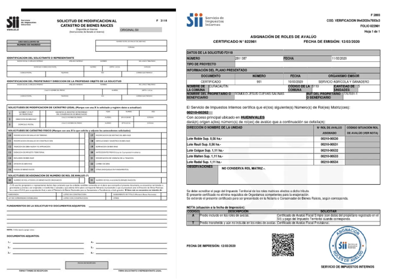 Se deberá llenar el formulario F2118 solicitando la asignación de rol de los lotes resultantes, en el departamento de evaluaciones.