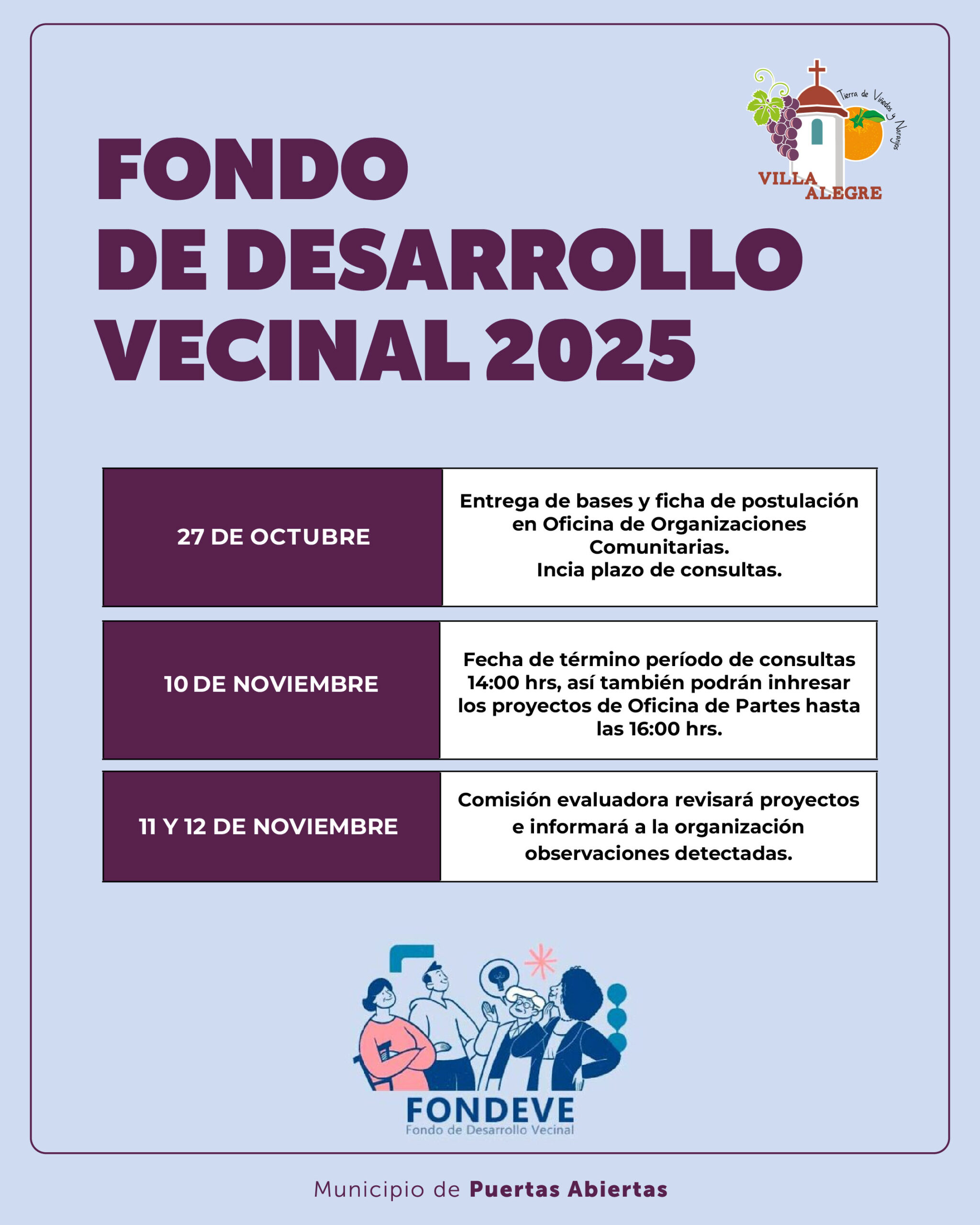 La Ilustre Municipalidad de Villa Alegre invita a todas las Juntas de Vecinos de la comuna a informarse sobre las bases y plazos de postulación al Fondo de Desarrollo Vecinal (FONDEVE) 2025, una herramienta que impulsa la participación ciudadana y el trabajo conjunto con las autoridades locales.