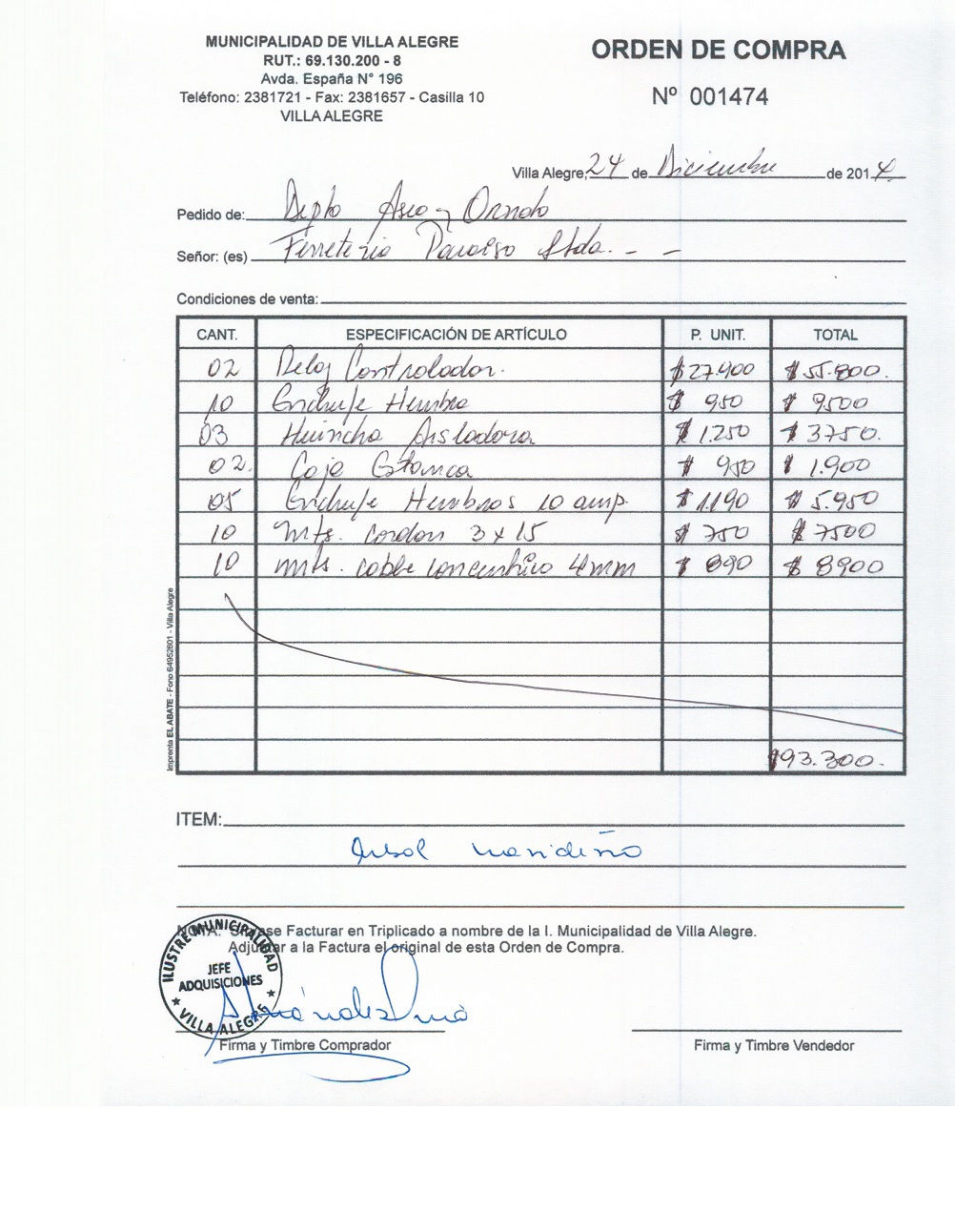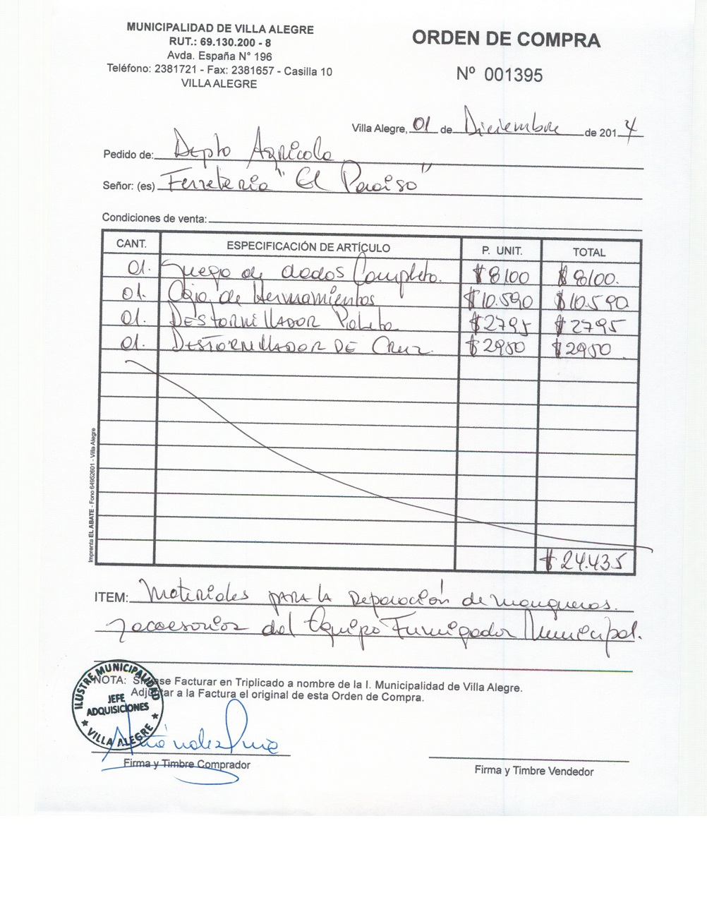 | Compras menores a 3 UTM | Orden de Compra | AUTORêZASE todas las Adquisiciones de 3 UTM, 10 UTM, las Licitaciones hasta 100 UTM, adem‡s de las compras a realizar a travŽs del Cat‡logo Electr—nico | 31/12/13 | 1423 | FERRETERIA PARAISO LTDA. | 76106150-K | MATERIALES PARA SISTEMA DE RIEGO 12 DE OCTUBRE Y SERAFIN GUTIERREZ | 11/12/14 | 11/12/14 | $ 89.940 | Enlace | |||||||