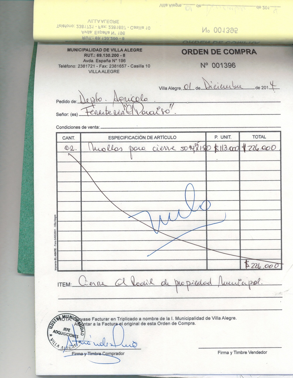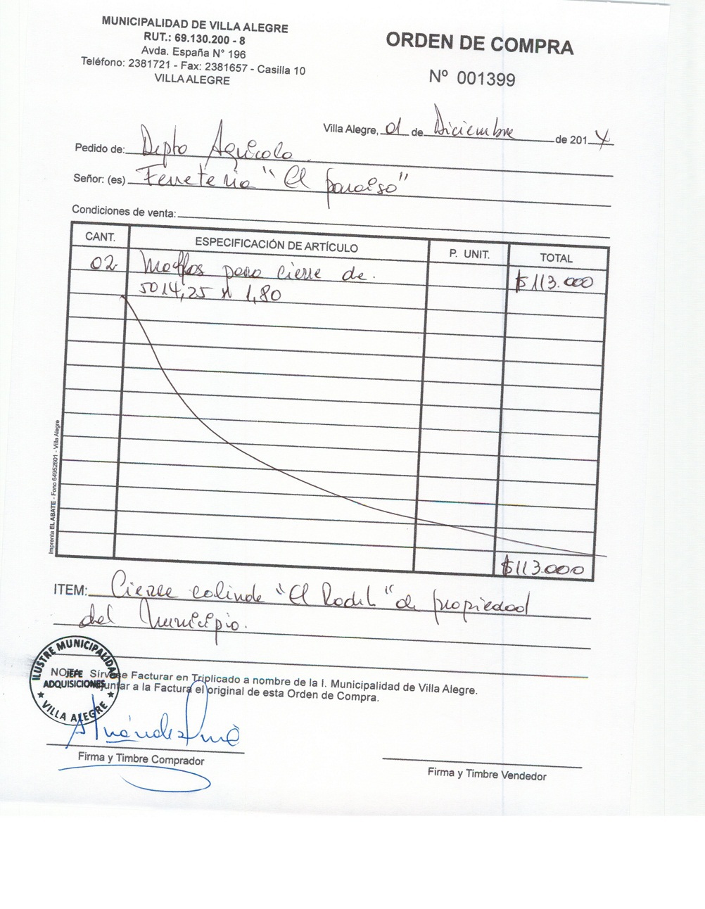 | Compras menores a 3 UTM | Orden de Compra | AUTORêZASE todas las Adquisiciones de 3 UTM, 10 UTM, las Licitaciones hasta 100 UTM, adem‡s de las compras a realizar a travŽs del Cat‡logo Electr—nico | 31/12/13 | 1399 | FERRETERIA PARAISO LTDA. | 76106150-K | CIERRE COLINDE PROPIEDAD "EL RODIL" | 01/12/14 | 01/12/14 | $ 113.000 | Enlace | |||||||