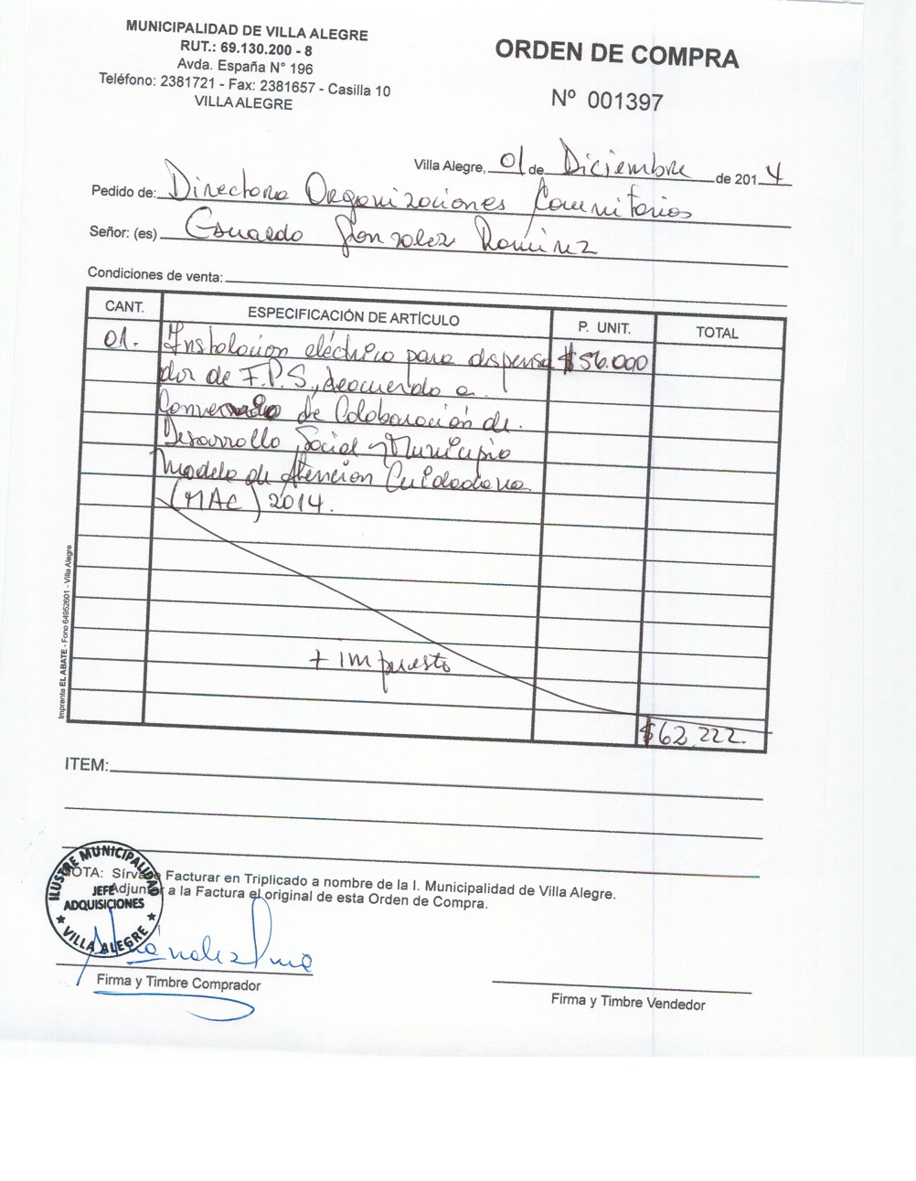 | Compras menores a 3 UTM | Orden de Compra | AUTORêZASE todas las Adquisiciones de 3 UTM, 10 UTM, las Licitaciones hasta 100 UTM, adem‡s de las compras a realizar a travŽs del Cat‡logo Electr—nico | 31/12/13 | 1397 | EDUARDO | GONZALEZ | RAMIREZ | 12372211-6 | INSTALACION ELECTRICA DISPENSADOR FICHA DE PROTECCION SOCIAL | 01/12/14 | 01/12/14 | $ 62.222 | Enlace | |||||