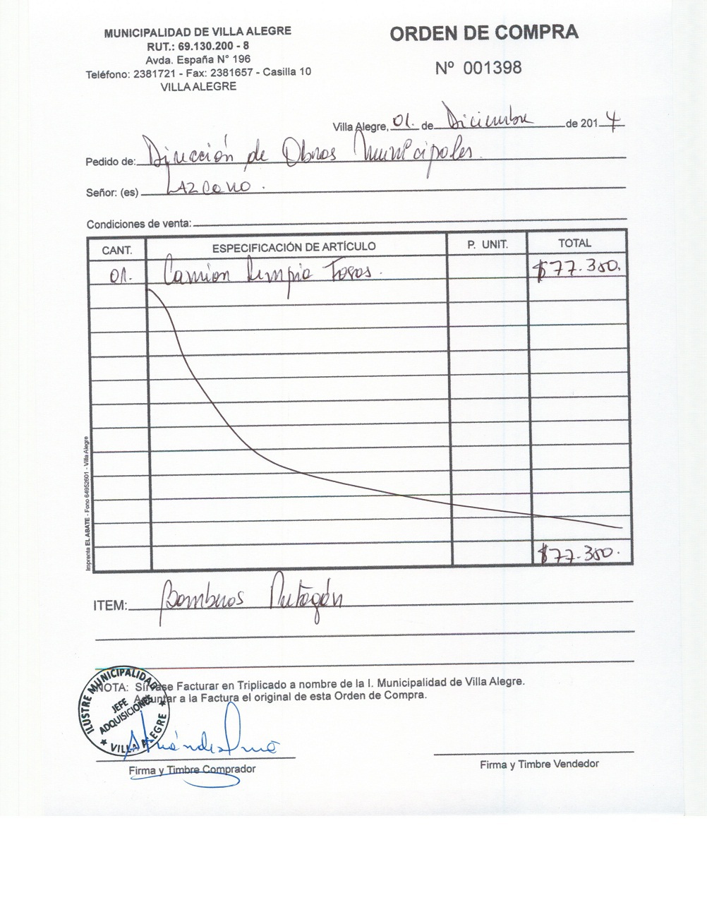 | Compras menores a 3 UTM | Orden de Compra | AUTORêZASE todas las Adquisiciones de 3 UTM, 10 UTM, las Licitaciones hasta 100 UTM, adem‡s de las compras a realizar a travŽs del Cat‡logo Electr—nico | 31/12/13 | 1398 | SERVICIO Y CONSTRUCCION FERNANDO LAZCANO LTDA. | 79908510-0 | LIMPIEZA DE FOSA SEPTICA BOMBEROS PUTAGAN | 01/12/14 | 01/12/14 | $ 77.350 | Enlace | |||||||