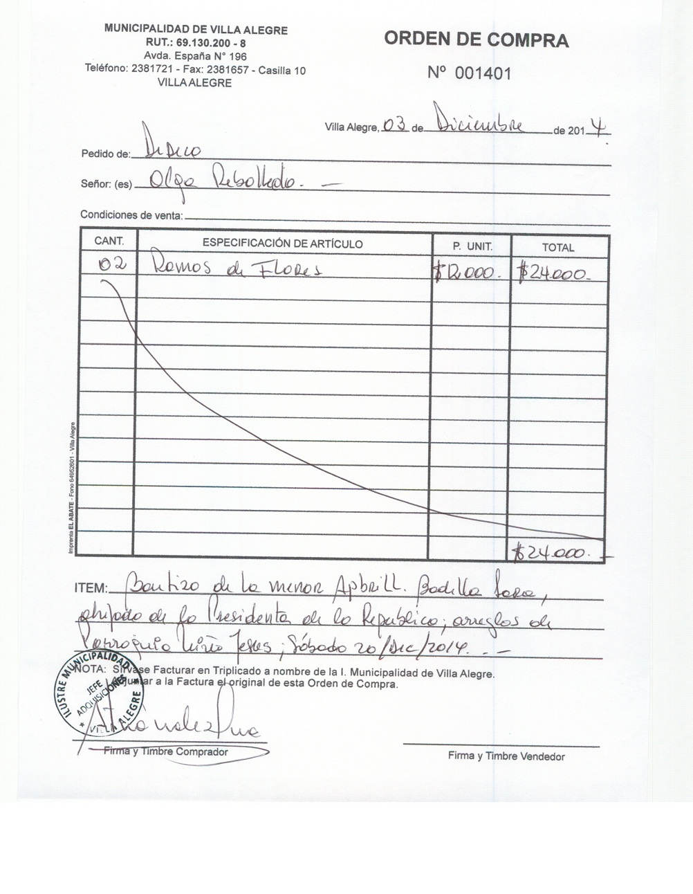 | Compras menores a 3 UTM | Orden de Compra | AUTORêZASE todas las Adquisiciones de 3 UTM, 10 UTM, las Licitaciones hasta 100 UTM, adem‡s de las compras a realizar a travŽs del Cat‡logo Electr—nico | 31/12/13 | 1401 | OLGA | REBOLLEDO | ARAYA | 10047620-7 | RAMOS FLORALES PARA ARREGLO DE PARROQUIA POR BAUTIZO AHIJADA DE LA SRA. PRESIDENTE DE LA REPUBLICA | 03/12/14 | 03/12/14 | $ 24.000 | Enlace | |||||