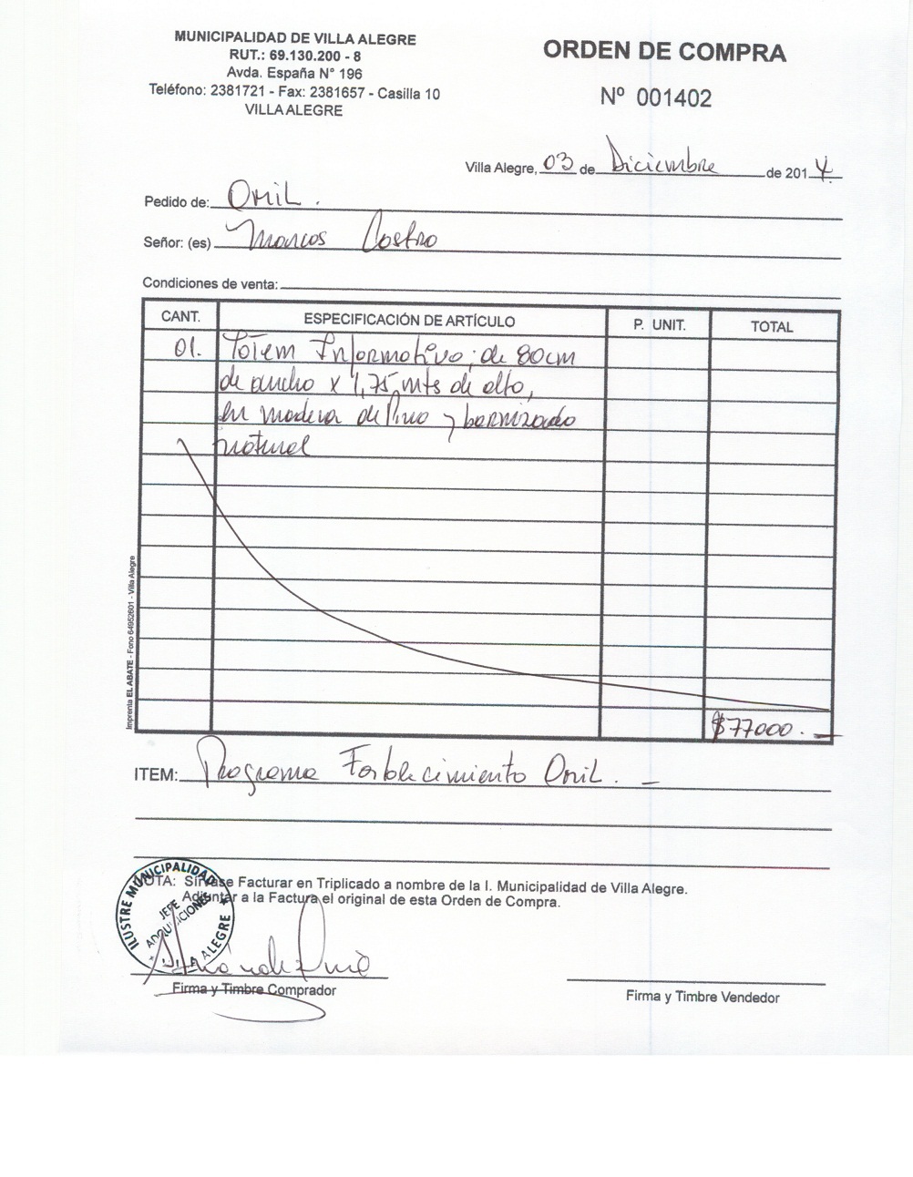 | Compras menores a 3 UTM | Orden de Compra | AUTORêZASE todas las Adquisiciones de 3 UTM, 10 UTM, las Licitaciones hasta 100 UTM, adem‡s de las compras a realizar a travŽs del Cat‡logo Electr—nico | 31/12/13 | 1402 | MARCO | CASTRO | SILVA | 9546927-2 | TOTEM INFORMATIVO PROGRAMA FORTALECIMIENTO OMIL | 03/12/14 | 03/12/14 | $ 77.000 | Enlace | |||||