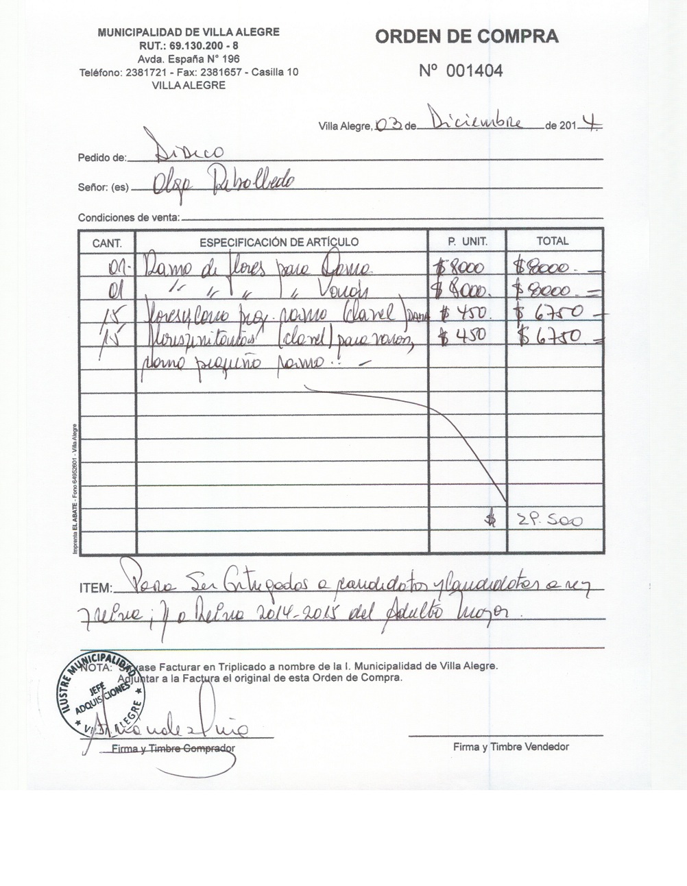 | Compras menores a 3 UTM | Orden de Compra | AUTORêZASE todas las Adquisiciones de 3 UTM, 10 UTM, las Licitaciones hasta 100 UTM, adem‡s de las compras a realizar a travŽs del Cat‡logo Electr—nico | 31/12/13 | 1404 | OLGA | REBOLLEDO | ARAYA | 10047620-7 | ARREGLOS FLORALES PARA SER ENTREGADOS A REY Y REINA CELEBRACION DEL ADULTO MAYOR | 03/12/14 | 03/12/14 | $ 29.500 | Enlace | |||||