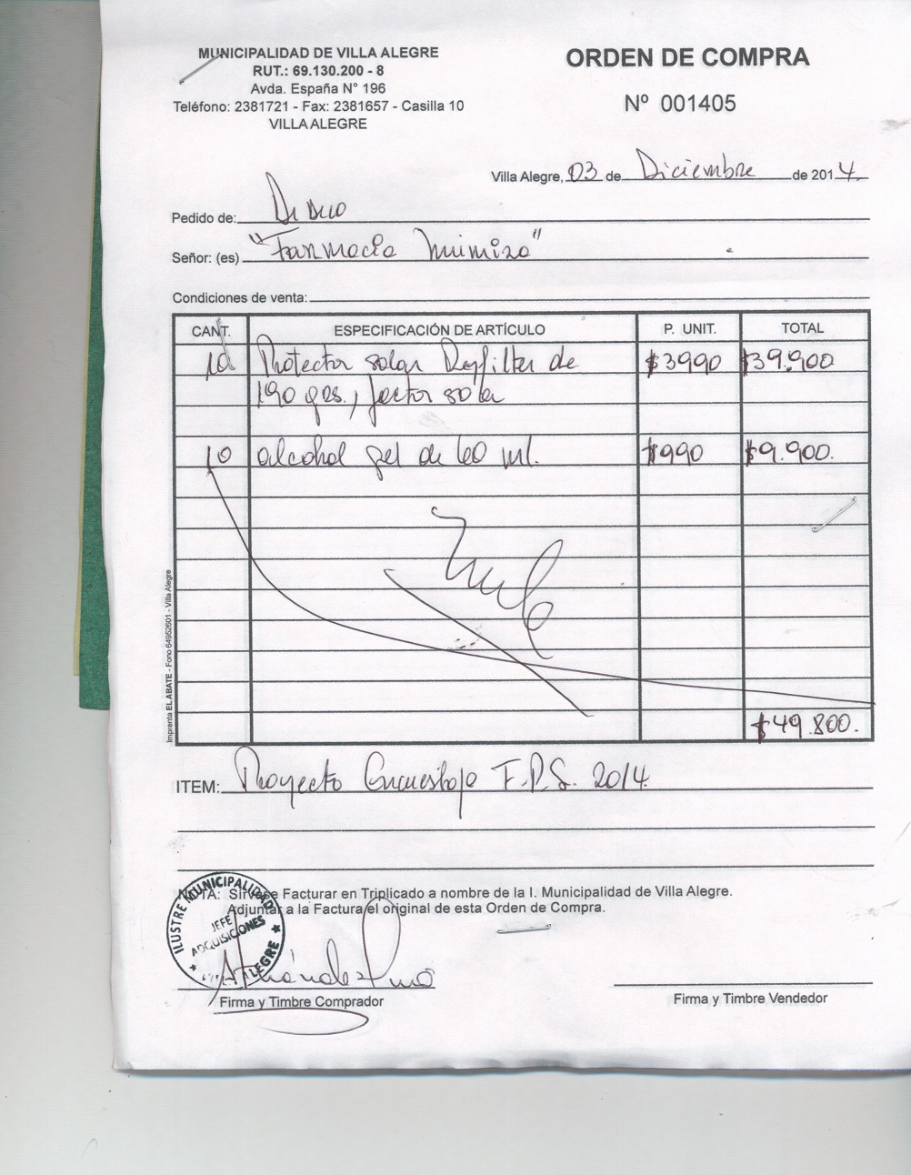 | Compras menores a 3 UTM | Orden de Compra | AUTORêZASE todas las Adquisiciones de 3 UTM, 10 UTM, las Licitaciones hasta 100 UTM, adem‡s de las compras a realizar a travŽs del Cat‡logo Electr—nico | 31/12/13 | 1410 | GLORIA MORA MU„OZ (FARMACIA MIMIZA) | 10974259-7 | PROTECTORES SOLARES PROGRAMA ENCUESTAJE FPS 2014 | 04/12/14 | 04/12/14 | $ 50.000 | Enlace | |||||||
