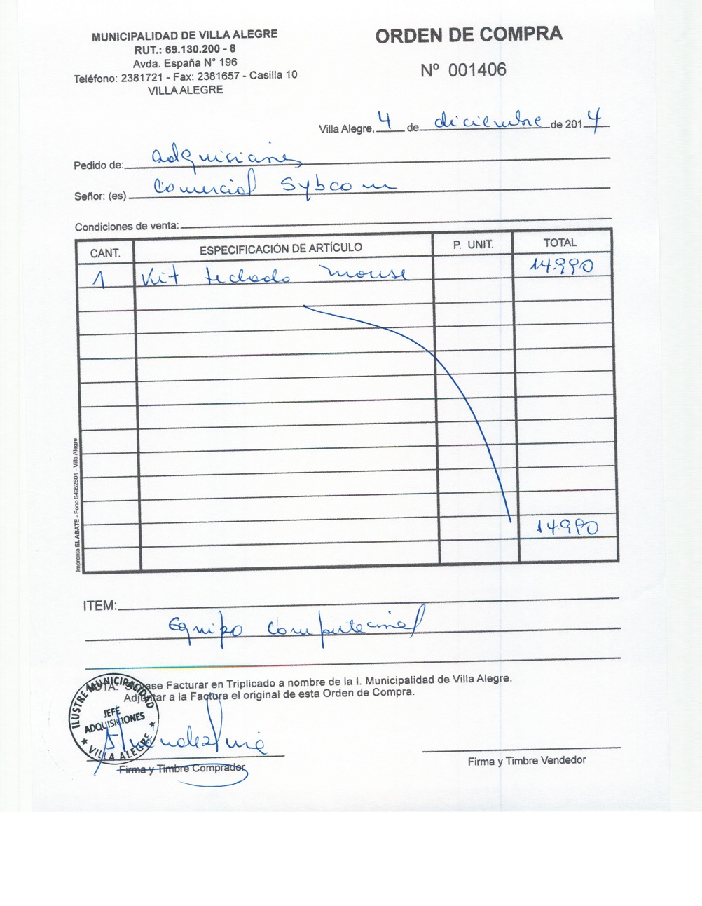 | Compras menores a 3 UTM | Orden de Compra | AUTORêZASE todas las Adquisiciones de 3 UTM, 10 UTM, las Licitaciones hasta 100 UTM, adem‡s de las compras a realizar a travŽs del Cat‡logo Electr—nico | 31/12/13 | 1406 | COMERCIAL SYBCOM LIMITADA | 76095909-k | KIT TECLADO MOUSE | 04/12/14 | 04/12/14 | $ 14.990 | Enlace | |||||||