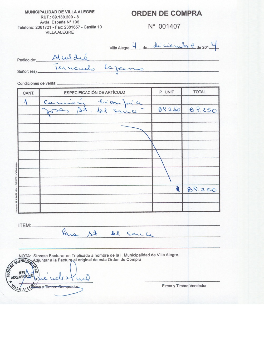 | Compras menores a 3 UTM | Orden de Compra | AUTORêZASE todas las Adquisiciones de 3 UTM, 10 UTM, las Licitaciones hasta 100 UTM, adem‡s de las compras a realizar a travŽs del Cat‡logo Electr—nico | 31/12/13 | 1407 | SERVICIO Y CONSTRUCCION FERNANDO LAZCANO LTDA. | 79908510-0 | LIMPIEZA DE FOSA SEPTICA SECTOR EL SUACE | 04/12/14 | 04/12/14 | $ 89.250 | Enlace | |||||||