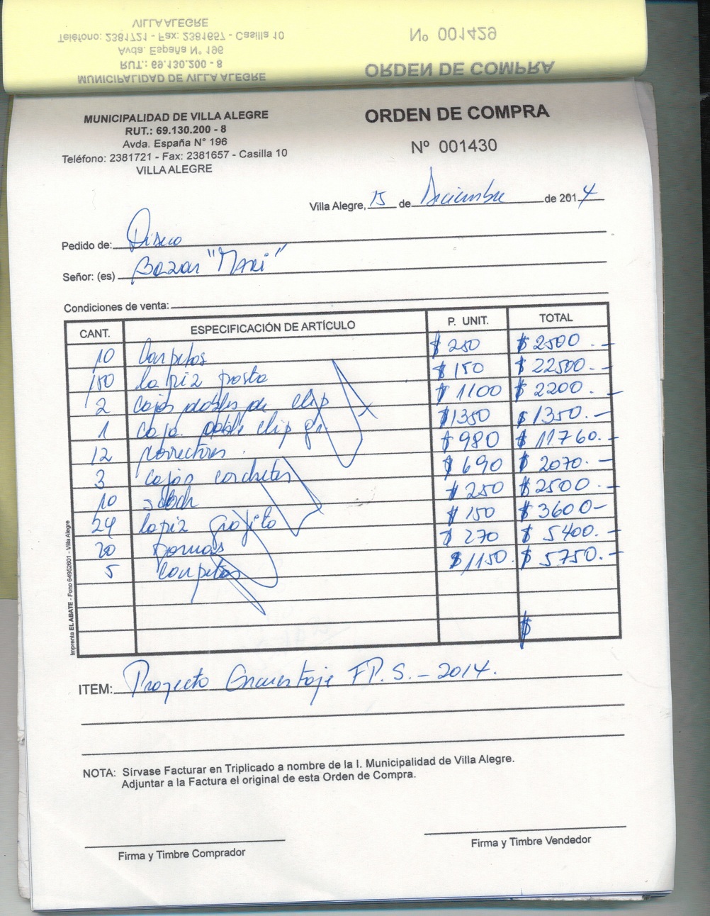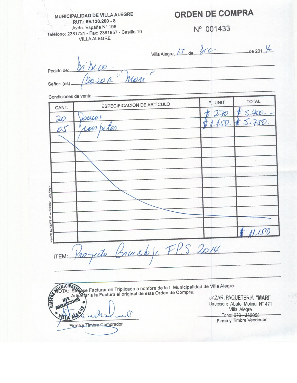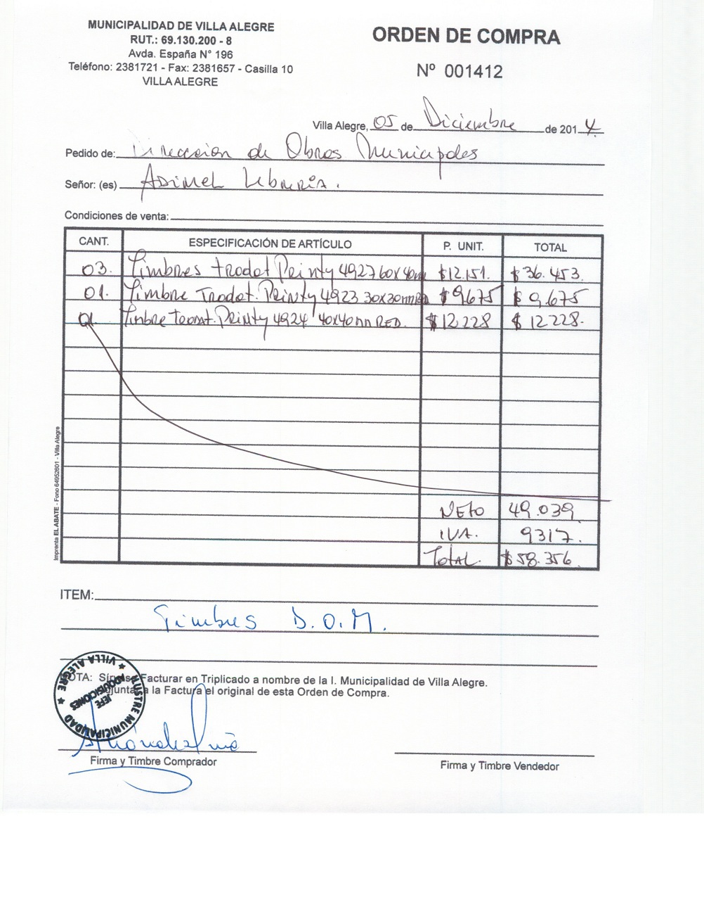 | Compras menores a 3 UTM | Orden de Compra | AUTORêZASE todas las Adquisiciones de 3 UTM, 10 UTM, las Licitaciones hasta 100 UTM, adem‡s de las compras a realizar a travŽs del Cat‡logo Electr—nico | 31/12/13 | 1412 | ADIMEL LIBRERêA | 77156770-3 | TIMBRES PARA DIRECCION DE OBRAS | 05/12/14 | 05/12/14 | $ 58.356 | Enlace | |||||||