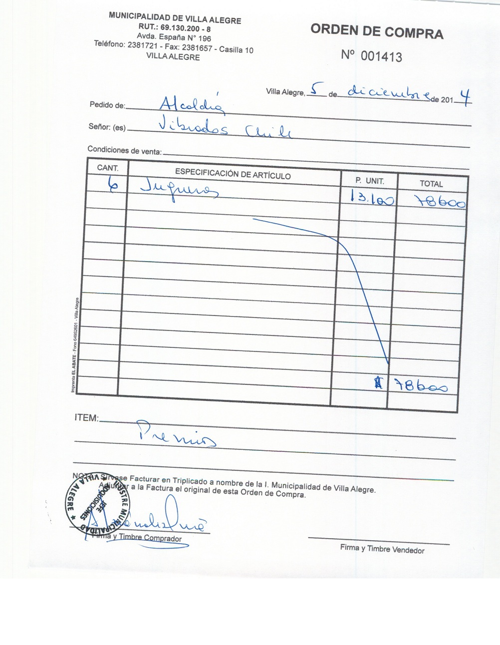 | Compras menores a 3 UTM | Orden de Compra | AUTORêZASE todas las Adquisiciones de 3 UTM, 10 UTM, las Licitaciones hasta 100 UTM, adem‡s de las compras a realizar a travŽs del Cat‡logo Electr—nico | 31/12/13 | 1413 | VIBRADOS CHILE LTDA. | 77748100-2 | JUGUERAS PARA DIVERSOS PREMIOS | 05/12/14 | 05/12/14 | $ 78.600 | Enlace | |||||||