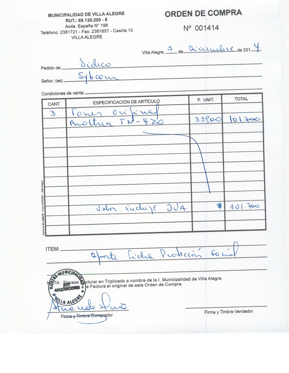 | Compras menores a 3 UTM | Orden de Compra | AUTORêZASE todas las Adquisiciones de 3 UTM, 10 UTM, las Licitaciones hasta 100 UTM, adem‡s de las compras a realizar a travŽs del Cat‡logo Electr—nico | 31/12/13 | 1414 | COMERCIAL SYBCOM LIMITADA | 76095909-k | TONER PARA ENCUESTAJE FICHA PROTECCION SOCIAL | 05/12/14 | 05/12/14 | $ 101.700 | Enlace | |||||||
