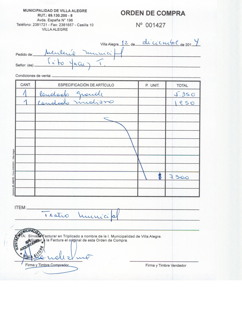 | Compras menores a 3 UTM | Orden de Compra | AUTORêZASE todas las Adquisiciones de 3 UTM, 10 UTM, las Licitaciones hasta 100 UTM, adem‡s de las compras a realizar a travŽs del Cat‡logo Electr—nico | 31/12/13 | 1427 | TITO | YA„EZ | TOLEDO | 4127592-8 | CANDADOS PARA TEATRO MUNICIPAL | 12/12/14 | 12/12/14 | $ 7.300 | Enlace | |||||
