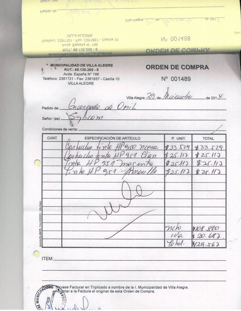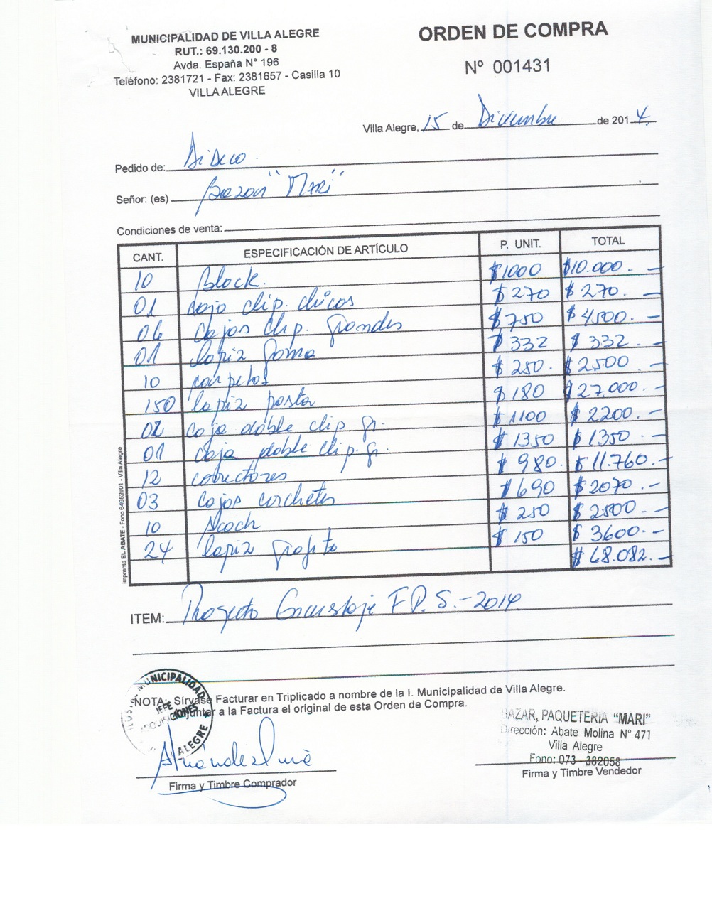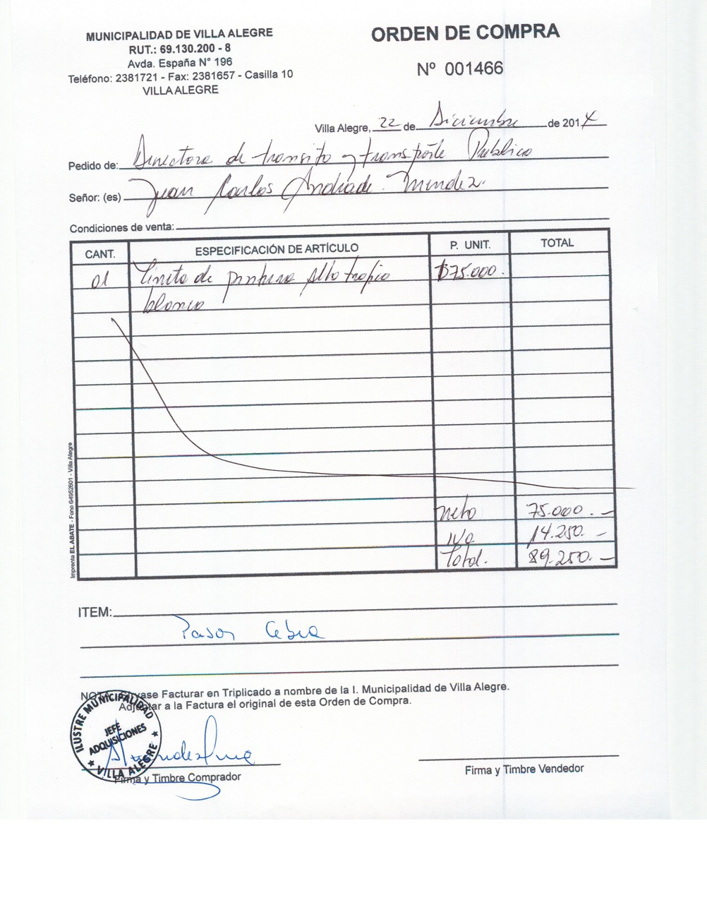 | Compras menores a 3 UTM | Orden de Compra | AUTORêZASE todas las Adquisiciones de 3 UTM, 10 UTM, las Licitaciones hasta 100 UTM, adem‡s de las compras a realizar a travŽs del Cat‡logo Electr—nico | 31/12/13 | 1420 | RODRIGO | NARVAEZ | JARA | 9179599-K | FORMULARIOS PARA PERMISOS | 10/12/14 | 10/12/14 | $ 63.070 | Enlace | |||||