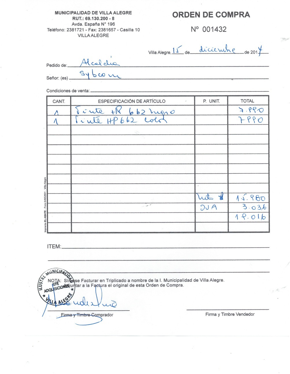 | Compras menores a 3 UTM | DECRETO ALCALDICIO | AUTORêZASE todas las Adquisiciones de 3 UTM, 10 UTM, las Licitaciones hasta 100 UTM, adem‡s de las compras a realizar a travŽs del Cat‡logo Electr—nico | 31/12/13 | 1432 | COMERCIAL SYBCOM LIMITADA | 76095909-k | TINTAS PARA IMPRESORA ALCALDIA | 15/12/14 | 15/12/14 | $ 19.016 | Enlace | |||||||