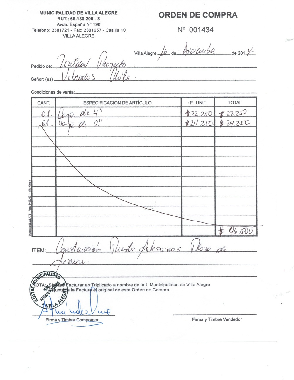 | Compras menores a 3 UTM | DECRETO ALCALDICIO | AUTORêZASE todas las Adquisiciones de 3 UTM, 10 UTM, las Licitaciones hasta 100 UTM, adem‡s de las compras a realizar a travŽs del Cat‡logo Electr—nico | 31/12/13 | 1434 | VIBRADOS CHILE LTDA. | 77748100-2 | CONSTRUCCION PUESTO ARTESANOS PLAZA DE ARMAS | 16/12/14 | 16/12/14 | $ 46.500 | Enlace | |||||||