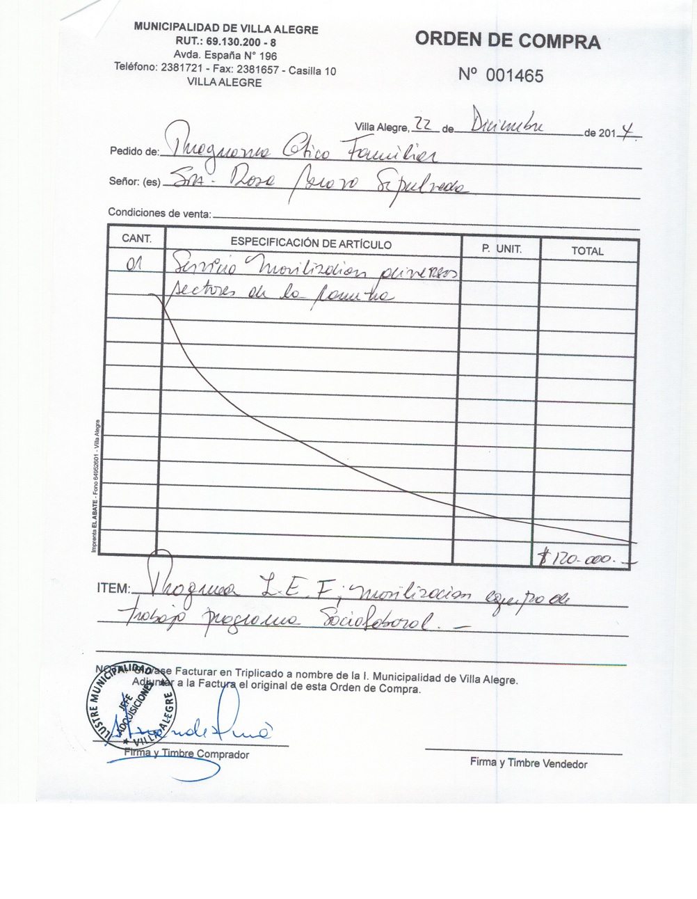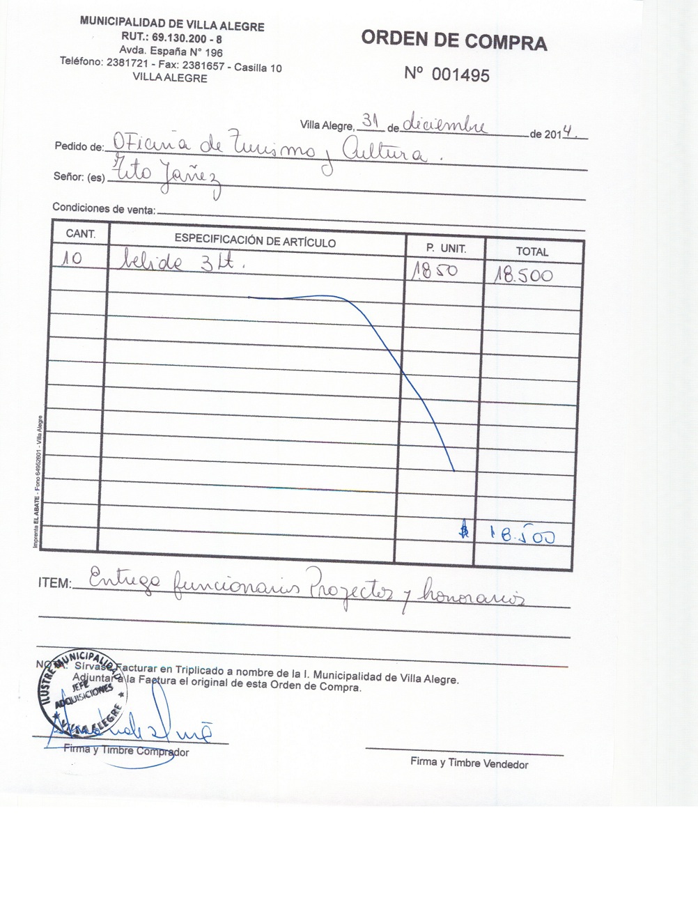 | Compras menores a 3 UTM | DECRETO ALCALDICIO | AUTORêZASE todas las Adquisiciones de 3 UTM, 10 UTM, las Licitaciones hasta 100 UTM, adem‡s de las compras a realizar a travŽs del Cat‡logo Electr—nico | 31/12/13 | 1436 | EDUARDO QUIROZ ARAYA (IMPRENTA VENES) | 76046461-9 | HOJAS PREIMPRESAS PARA INGRESOS TESORERIA MUNICIPAL | 16/12/14 | 16/12/14 | $ 120.000 | Enlace | |||||||