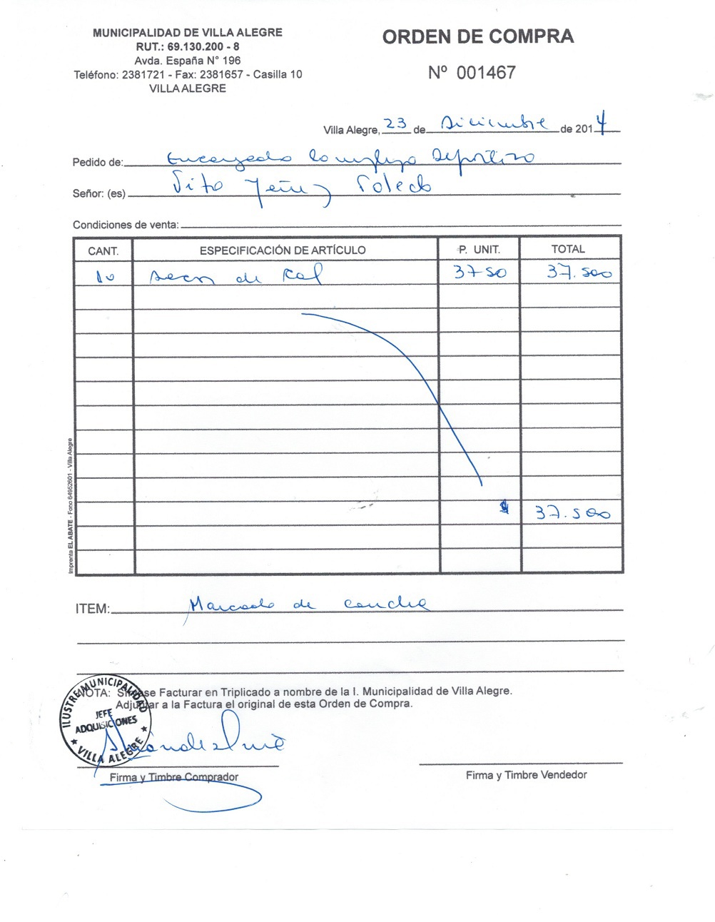 | Compras menores a 3 UTM | DECRETO ALCALDICIO | AUTORêZASE todas las Adquisiciones de 3 UTM, 10 UTM, las Licitaciones hasta 100 UTM, adem‡s de las compras a realizar a travŽs del Cat‡logo Electr—nico | 31/12/13 | 1467 | TITO | YA„EZ | TOLEDO | 4127592-8 | CAL PARA MARCADO CANCHA DE FUTBOL | 23/12/14 | 23/12/14 | $ 37.500 | Enlace | |||||