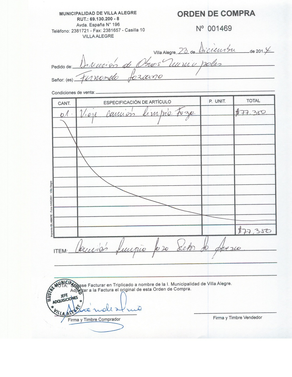 | Compras menores a 3 UTM | DECRETO ALCALDICIO | AUTORêZASE todas las Adquisiciones de 3 UTM, 10 UTM, las Licitaciones hasta 100 UTM, adem‡s de las compras a realizar a travŽs del Cat‡logo Electr—nico | 31/12/13 | 1469 | SERVICIO Y CONSTRUCCION FERNANDO LAZCANO LTDA. | 79908510-0 | LIMPIEZA DE FOSA SEPTICA SECTOR LA ARENA | 23/12/14 | 23/12/14 | $ 77.350 | Enlace | |||||||
