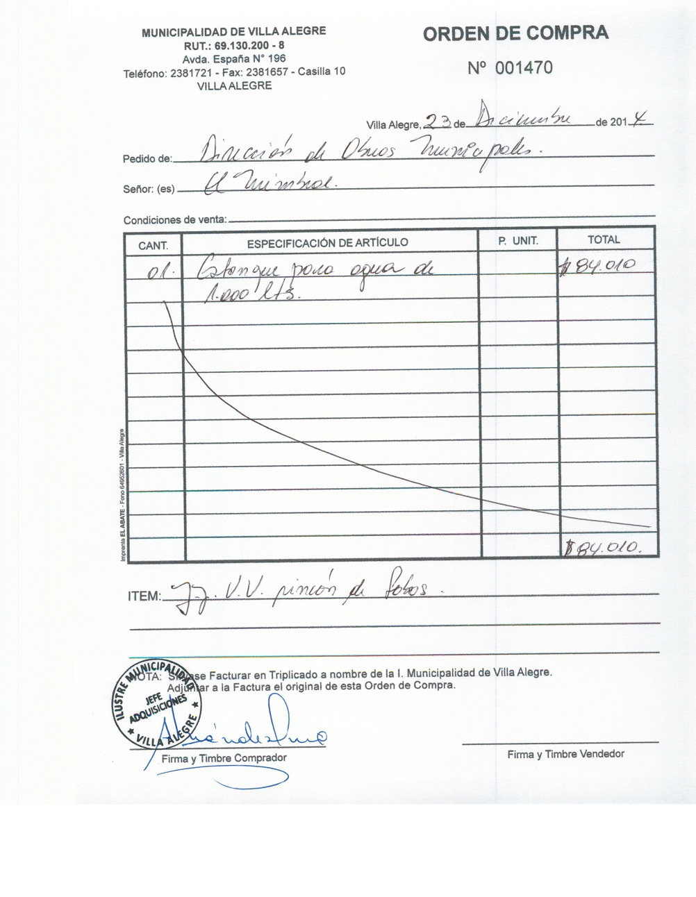 | Compras menores a 3 UTM | DECRETO ALCALDICIO | AUTORêZASE todas las Adquisiciones de 3 UTM, 10 UTM, las Licitaciones hasta 100 UTM, adem‡s de las compras a realizar a travŽs del Cat‡logo Electr—nico | 31/12/13 | 1470 | SOCIEDAD COMERCIAL EL MIMBRAL | 76004335-4 | ESTANQUE PARA AGUA JJ.VV. RINCON DE LOBOS | 23/12/14 | 23/12/14 | $ 84.010 | Enlace | |||||||