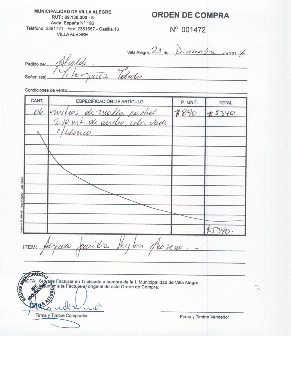 | Compras menores a 3 UTM | Orden de Compra | AUTORêZASE todas las Adquisiciones de 3 UTM, 10 UTM, las Licitaciones hasta 100 UTM, adem‡s de las compras a realizar a travŽs del Cat‡logo Electr—nico | 31/12/13 | 1472 | TITO | YA„EZ | TOLEDO | 4127592-8 | MALLA RACHEL PARA AYUDA SOCIAL | 23/12/14 | 23/12/14 | $ 5.340 | Enlace | |||||