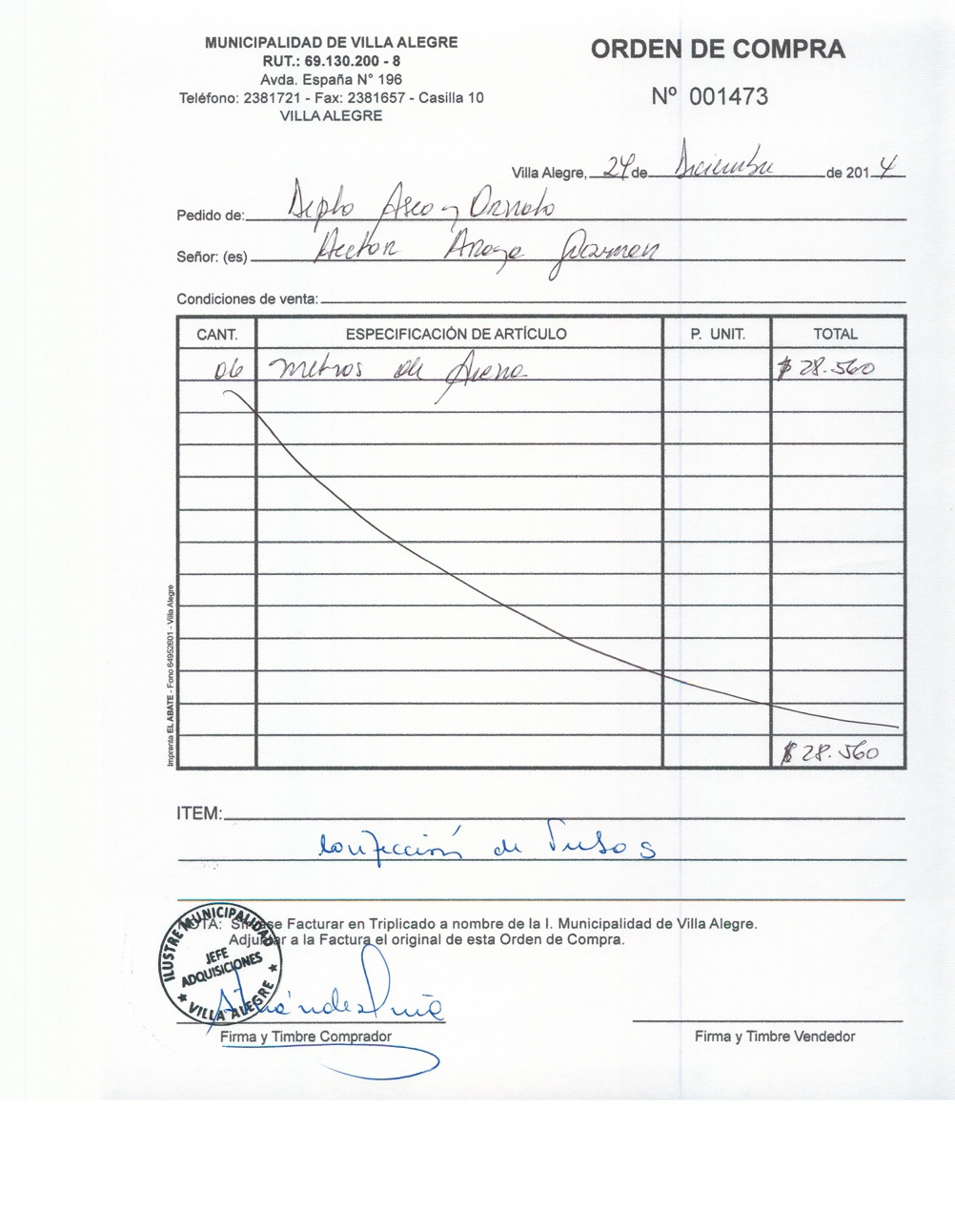 | Compras menores a 3 UTM | Orden de Compra | AUTORêZASE todas las Adquisiciones de 3 UTM, 10 UTM, las Licitaciones hasta 100 UTM, adem‡s de las compras a realizar a travŽs del Cat‡logo Electr—nico | 31/12/13 | 1473 | HECTOR | ARAYA | GUZMAN | 6079783-8 | ARENA PARA CONFECCION DE TUBOS | 24/12/14 | 24/12/14 | $ 28.560 | Enlace | |||||