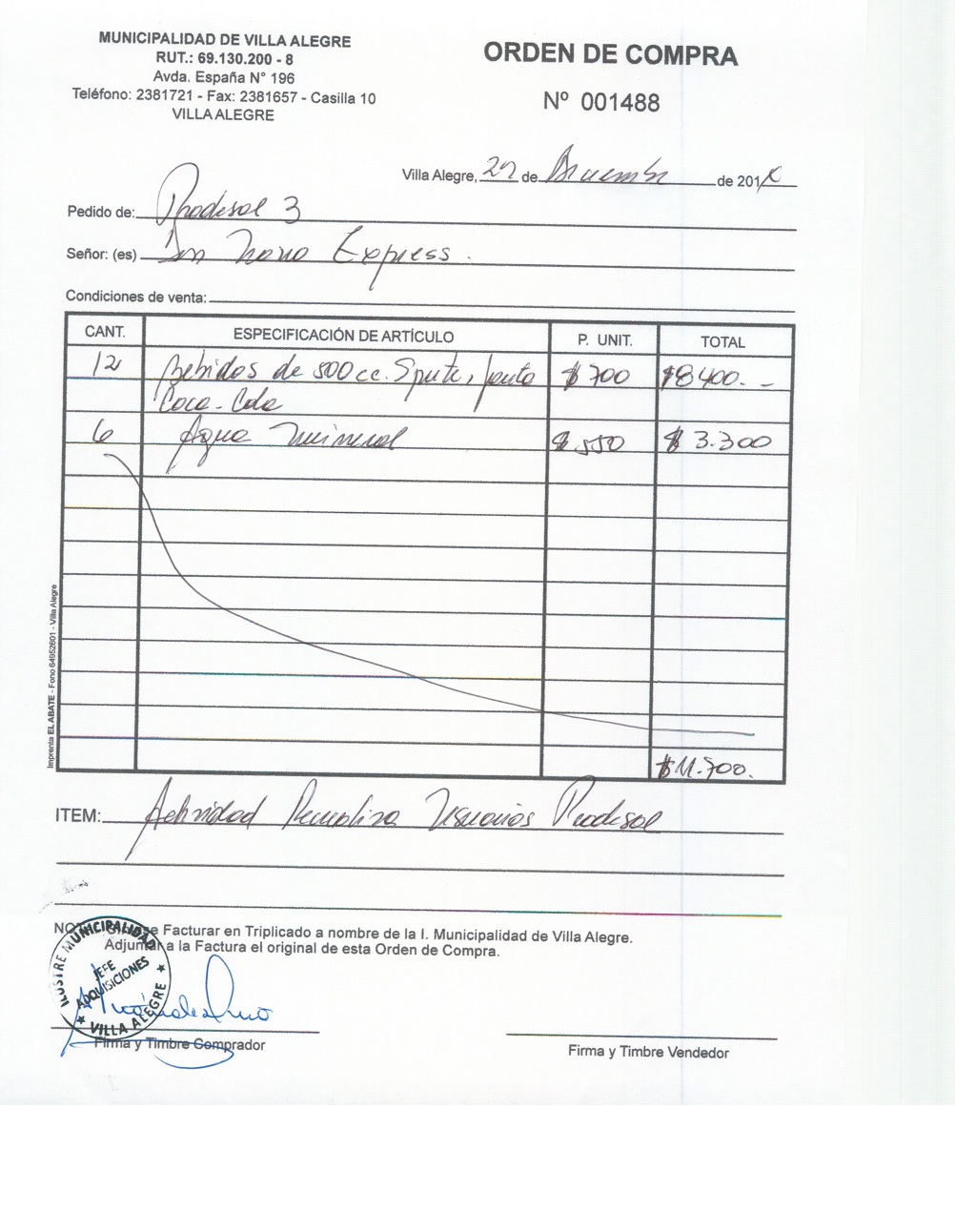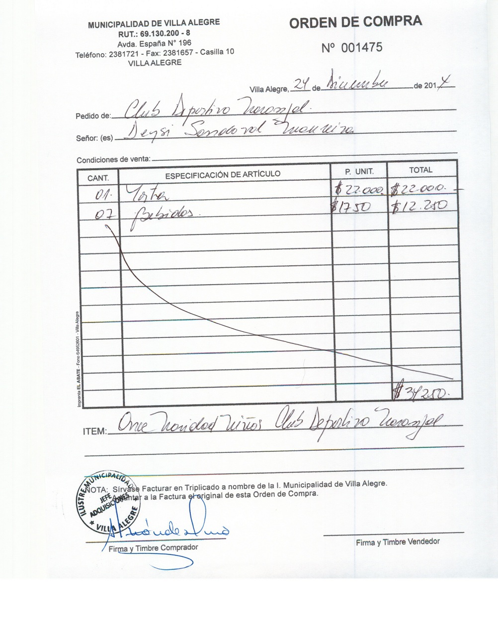 | Compras menores a 3 UTM | Orden de Compra | AUTORêZASE todas las Adquisiciones de 3 UTM, 10 UTM, las Licitaciones hasta 100 UTM, adem‡s de las compras a realizar a travŽs del Cat‡logo Electr—nico | 31/12/13 | 1475 | DAYSI SANDOVAL MAUREIRA | 11287171-3 | ALIMENTOS PARA ONCE NAVIDAD NI„OS CLUB DEPORTIVO NARANJAL | 24/12/14 | 24/12/14 | $ 34.250 | Enlace | |||||||