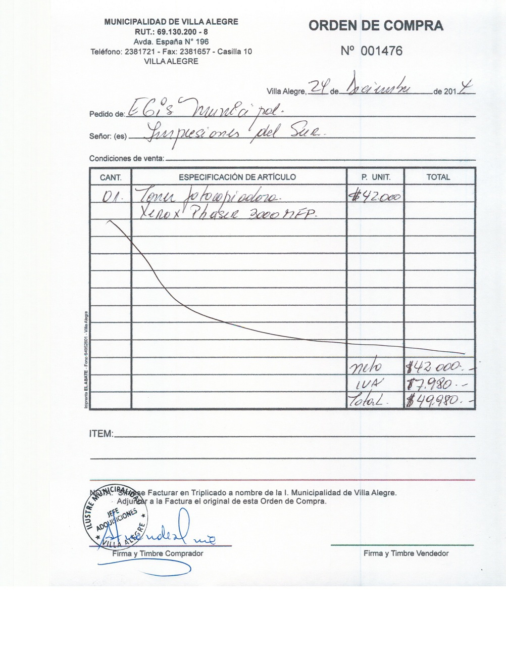 | Compras menores a 3 UTM | Orden de Compra | AUTORêZASE todas las Adquisiciones de 3 UTM, 10 UTM, las Licitaciones hasta 100 UTM, adem‡s de las compras a realizar a travŽs del Cat‡logo Electr—nico | 31/12/13 | 1476 | FELIPE VARGAS (IMPRESIONES DEL SUR) | 11744745-6 | TONER PARA FOTOCOPIADORA EGIS MUNICIPAL | 24/12/14 | 24/12/14 | $ 49.980 | Enlace | |||||||
