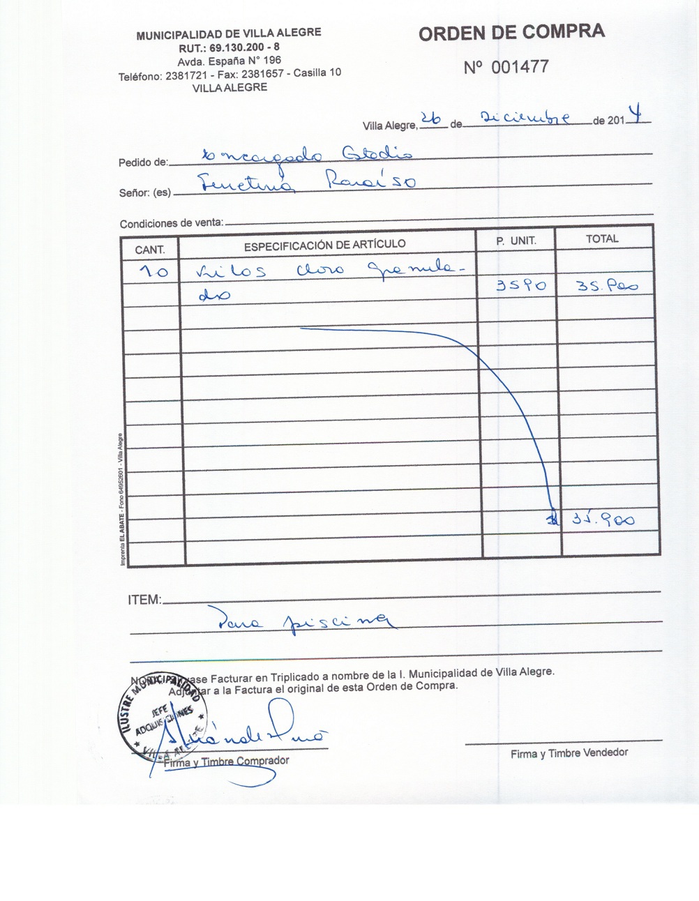 | Compras menores a 3 UTM | Orden de Compra | AUTORêZASE todas las Adquisiciones de 3 UTM, 10 UTM, las Licitaciones hasta 100 UTM, adem‡s de las compras a realizar a travŽs del Cat‡logo Electr—nico | 31/12/13 | 1477 | FERRETERIA PARAISO LTDA. | 76106150-K | CLORO GRANULADO PARA PISCINA MUNICIPAL | 26/12/14 | 26/12/14 | $ 35.900 | Enlace | |||||||