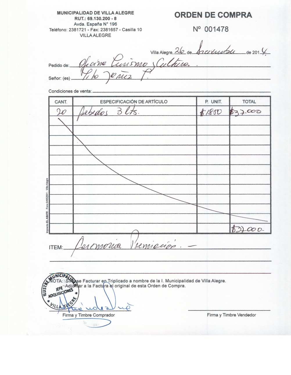 | Compras menores a 3 UTM | Orden de Compra | AUTORêZASE todas las Adquisiciones de 3 UTM, 10 UTM, las Licitaciones hasta 100 UTM, adem‡s de las compras a realizar a travŽs del Cat‡logo Electr—nico | 31/12/13 | 1478 | TITO | YA„EZ | TOLEDO | 4127592-8 | BEBIDAS PARA CEREMONIA DE PREMIACION | 26/12/14 | 26/12/14 | $ 37.000 | Enlace | |||||