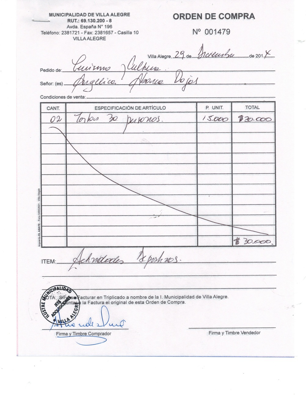 | Compras menores a 3 UTM | Orden de Compra | AUTORêZASE todas las Adquisiciones de 3 UTM, 10 UTM, las Licitaciones hasta 100 UTM, adem‡s de las compras a realizar a travŽs del Cat‡logo Electr—nico | 31/12/13 | 1479 | ANGELICA | ABARCA | ROJAS | 7868689-8 | TOTAS PARA ACTIVIDADES DEPORTIVAS | 26/12/14 | 26/12/14 | $ 30.000 | Enlace | |||||