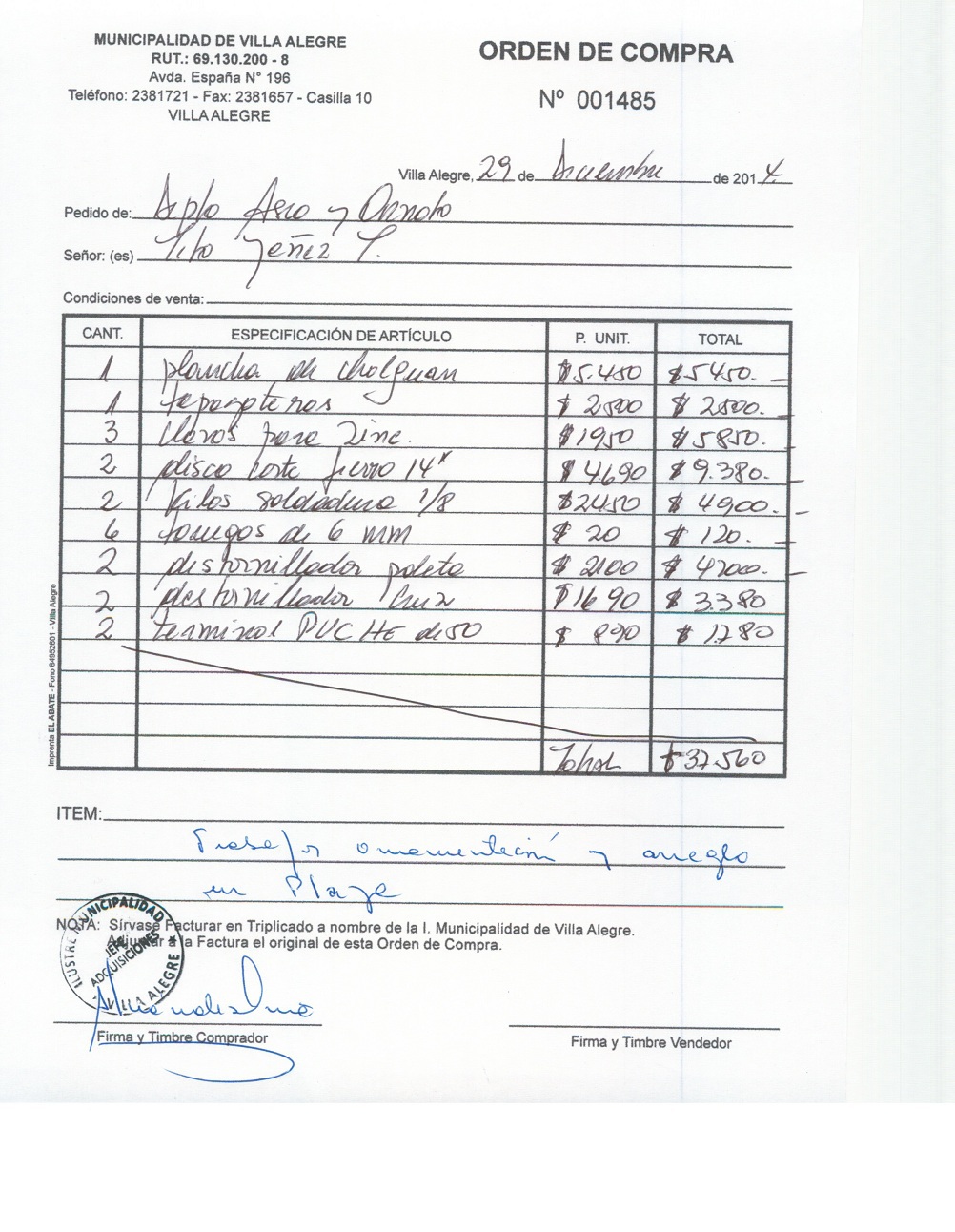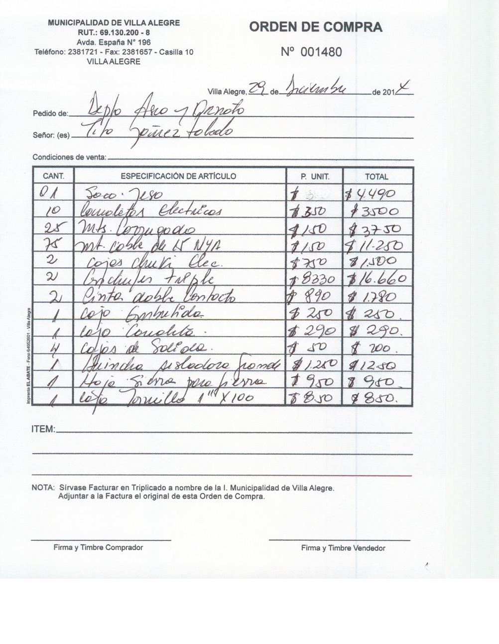 | Compras menores a 3 UTM | Orden de Compra | AUTORêZASE todas las Adquisiciones de 3 UTM, 10 UTM, las Licitaciones hasta 100 UTM, adem‡s de las compras a realizar a travŽs del Cat‡logo Electr—nico | 31/12/13 | 1480 | TITO | YA„EZ | TOLEDO | 4127592-8 | MATERIALES PARA REPARACIONES DIVERSAS | 29/12/14 | 29/12/14 | Enlace | ||||||