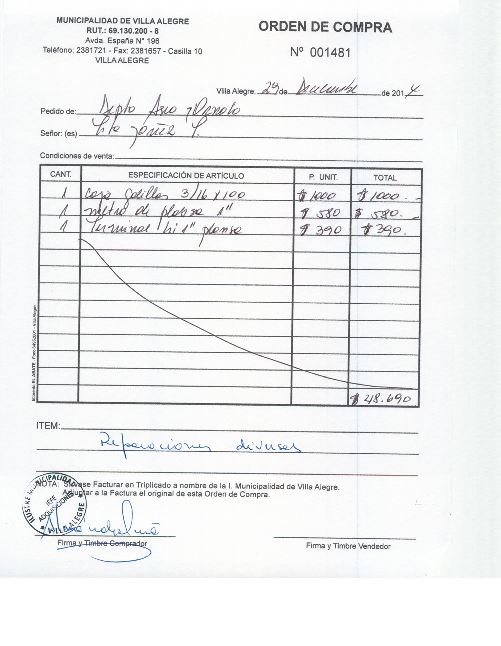 | Compras menores a 3 UTM | Orden de Compra | AUTORêZASE todas las Adquisiciones de 3 UTM, 10 UTM, las Licitaciones hasta 100 UTM, adem‡s de las compras a realizar a travŽs del Cat‡logo Electr—nico | 31/12/13 | 1481 | TITO | YA„EZ | TOLEDO | 4127592-8 | MATERIALES PARA REPARACIONES DIVERSAS | 29/12/14 | 29/12/14 | $ 48.690 | Enlace | |||||
