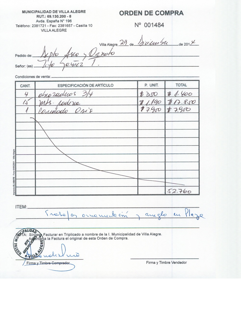 | Compras menores a 3 UTM | Orden de Compra | AUTORêZASE todas las Adquisiciones de 3 UTM, 10 UTM, las Licitaciones hasta 100 UTM, adem‡s de las compras a realizar a travŽs del Cat‡logo Electr—nico | 31/12/13 | 1482 | TITO | YA„EZ | TOLEDO | 4127592-8 | TRABAJOS ORNAMENTACION Y ARREGLO PLAZA | 29/12/14 | 29/12/14 | TERMINA EN LA 1484 | Enlace | |||||