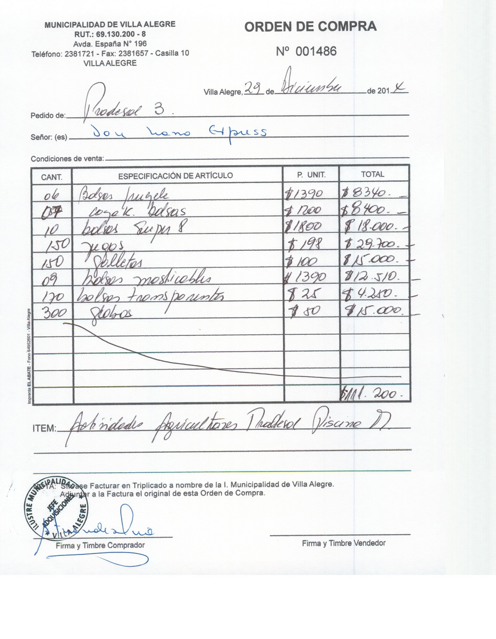 | Compras menores a 3 UTM | Orden de Compra | AUTORêZASE todas las Adquisiciones de 3 UTM, 10 UTM, las Licitaciones hasta 100 UTM, adem‡s de las compras a realizar a travŽs del Cat‡logo Electr—nico | 31/12/13 | 1486 | SOC.BUSTAMANTE VILLALOBOS Y CIA. LTDA. | 76913070-5 | INSUMOS ACTIVIDAD AGRICULTORES PRODESAL 3 | 29/12/14 | 29/12/14 | $ 111.200 | Enlace | Enlace | ||||||