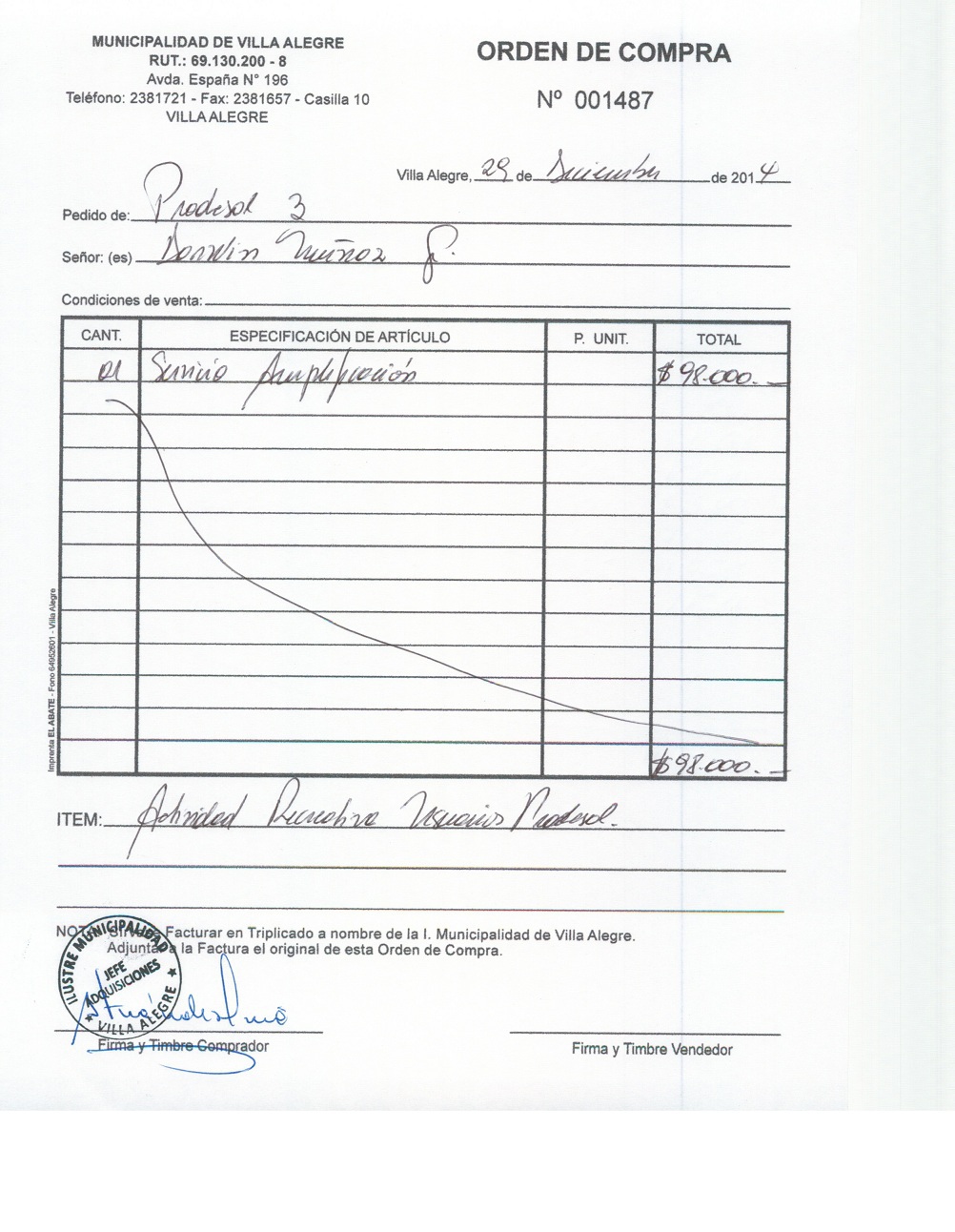 | Compras menores a 3 UTM | Orden de Compra | AUTORêZASE todas las Adquisiciones de 3 UTM, 10 UTM, las Licitaciones hasta 100 UTM, adem‡s de las compras a realizar a travŽs del Cat‡logo Electr—nico | 31/12/13 | 1487 | DARWIN | MU„OZ | GUTIERREZ | 10171283-4 | AMPLIFICACION ACTIVIDAD RECREATIVA PRODESAL 3 | 29/12/14 | 29/12/14 | $ 98.000 | Enlace | Enlace | ||||