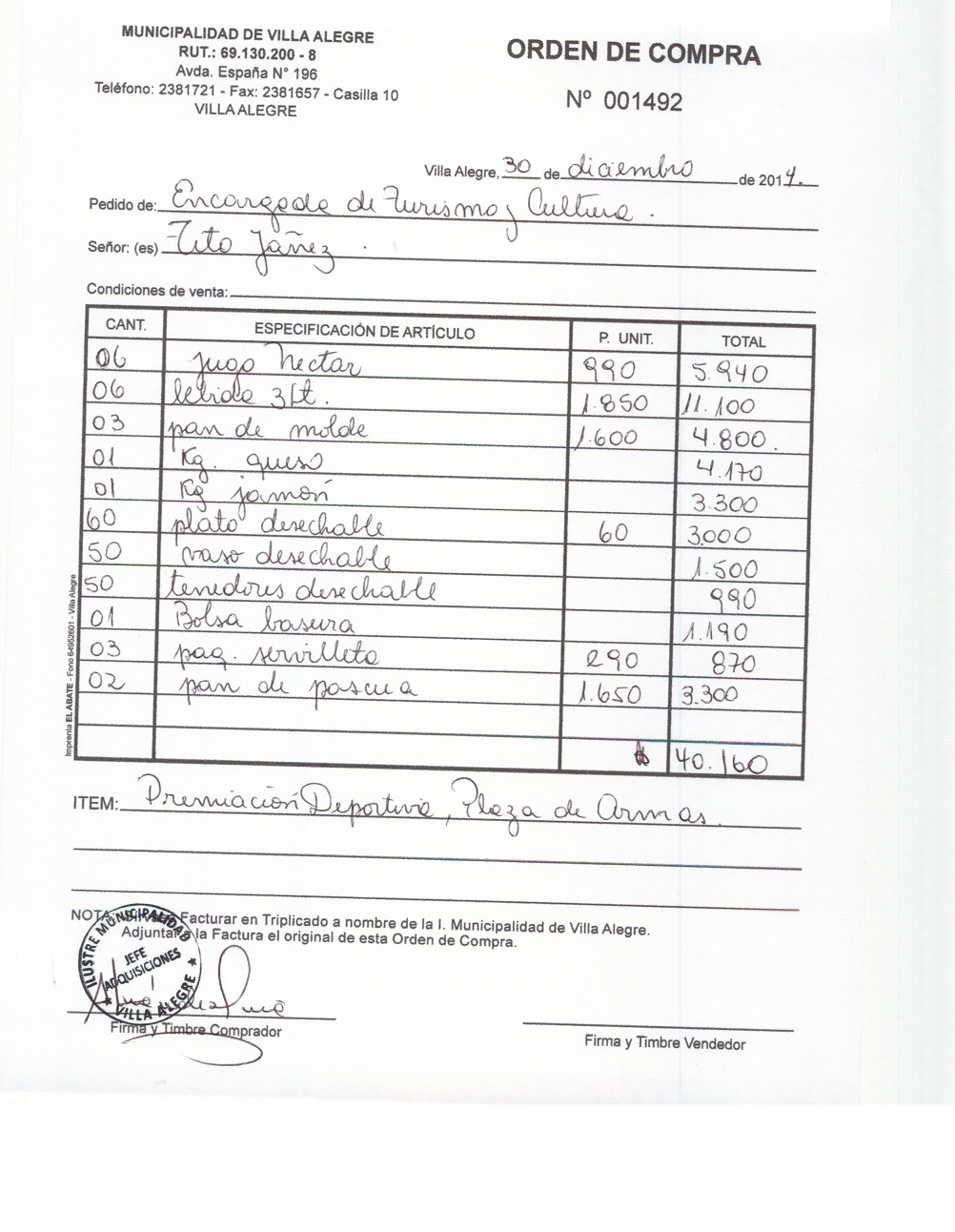 | Compras menores a 3 UTM | Orden de Compra | AUTORêZASE todas las Adquisiciones de 3 UTM, 10 UTM, las Licitaciones hasta 100 UTM, adem‡s de las compras a realizar a travŽs del Cat‡logo Electr—nico | 31/12/13 | 1492 | TITO | YA„EZ | TOLEDO | 4127592-8 | INSUMOS PREMIACION DEPORTIVA | 30/12/14 | 30/12/14 | $ 40.160 | Enlace | Enlace | ||||