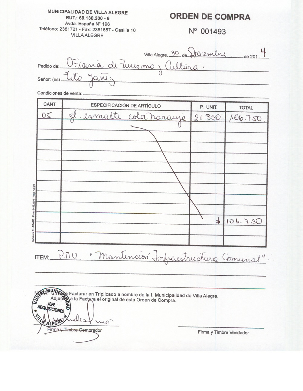 | Compras menores a 3 UTM | Orden de Compra | AUTORêZASE todas las Adquisiciones de 3 UTM, 10 UTM, las Licitaciones hasta 100 UTM, adem‡s de las compras a realizar a travŽs del Cat‡logo Electr—nico | 31/12/13 | 1493 | TITO | YA„EZ | TOLEDO | 4127592-8 | ESMALTE PARA TRABAJOS PMU | 30/12/14 | 30/12/14 | $ 106.750 | Enlace | Enlace | ||||