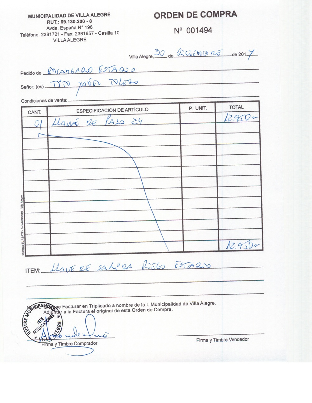 | Compras menores a 3 UTM | Orden de Compra | AUTORêZASE todas las Adquisiciones de 3 UTM, 10 UTM, las Licitaciones hasta 100 UTM, adem‡s de las compras a realizar a travŽs del Cat‡logo Electr—nico | 31/12/13 | 1494 | TITO | YA„EZ | TOLEDO | 4127592-8 | LLAVE DE PASO PARA RIEGO ESTADIO | 30/12/14 | 30/12/14 | $ 12.950 | Enlace | Enlace | ||||